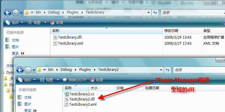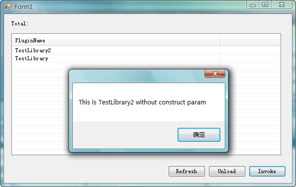 下面我们将Class1.cs编译好,放到插件目录中,改名为TestLibrary.dll,将Class2.cs直接改名为TestLibrary2.cs,放到插件目录中。 演示的目的:插件1需要在加载时,构造初始化函数,而插件2不需要。 插件1,是已经编译好的dll,不需要实时编译,但是插件2需要。